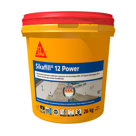 SikaFill®12 Power es una membrana líquida elástica e impermeable, para la protección flexible de losas de cubiertas y terrazas aptas para tránsito peatonal de mantenimiento. Este producto contiene una nueva fórmula, mejorada con la adición de los aditivos de la tecnología "AFA", fibras y carga de microesferas cerámicas, lo cual aumenta la durabilidad, resistencia, elásticidad y flexibilidad del producto, gracias a que contiene polímeros de última generación. Gracias a la incorporación de la tecnología de Microesferas Cerámicas, el producto se convierte en un reductor térmico ideal para superficies expuestas a los rayos UV.